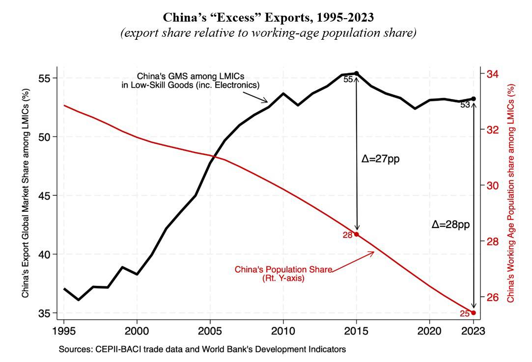 What makes this persistence even more striking is that China’s manufacturing wages are now far higher than those in LMICs – and still increasing. For example, in apparel, the canonical labour-intensive sector, the annual wage in China averages around US$10,000, which is roughly five times higher than in Bangladesh and four times higher than in India.